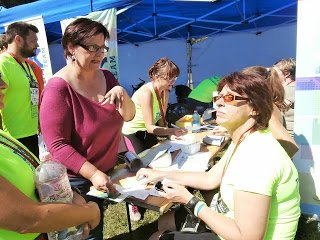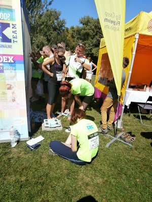 A vérnyomásmérést Hanga kartársnő megtanította nekem, és onnantól kezdve én mértem és mértem, az emberek ugyanis sorban álltak, nem túlzok, állati nagy sikere volt az egész programnak, a vérnyomásmérés után lehetett a szomszéd sátorban vércukrot méretni, de van egy nagyon tuti mérlege is a DK-nak , méri a súlyt, az izmot, a zsírt, kiszámolja a napi kalóriát és talán még énekel is. A legvégén én is rámerészkedtem, de erről majd később (nem azért, mert rossz lett az eredmény, Hanga nekem úgy kiértékelte, hoyg kitűztem az asztalommal szembeni táblára a cetlit).